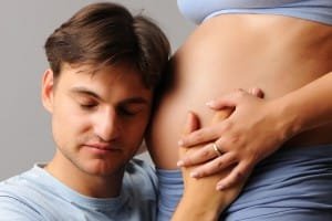 Happy pregnant couple over grey background